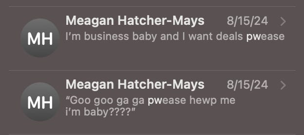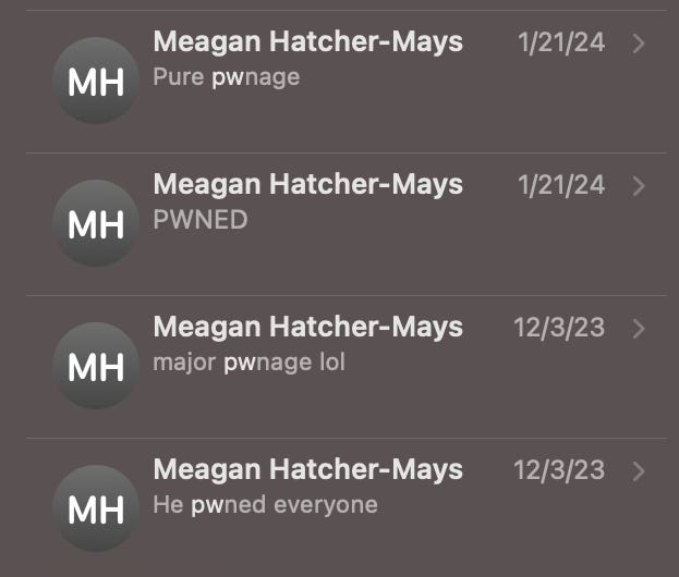Meagan just asked me for the Substack password and of course I have no idea, but I thought I’d already sent it to her, so I searched “pw” in our text history and here’s what I got: